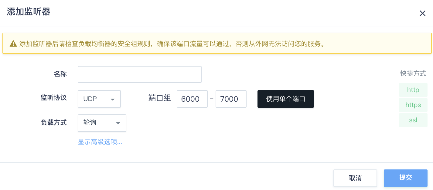 添加监听器后请检查负载均衡器的防火墙规则,确保 80 端口流量可以通过,否则从外网无法访问。另外,也可以通过点击右边 “快捷方式” 里头的 “http” 协议进行快速设置